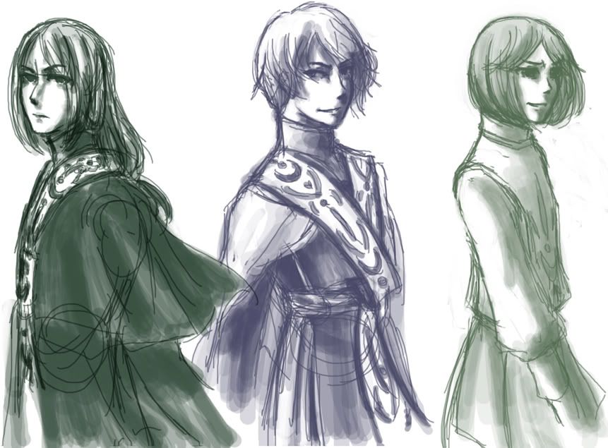 Three quickies in a row! Yeah, the quality kinda fell as I moved right. Like Ahts-y-poo's (not his actual name but he's the middle one) shoulders. Ouch. Younger Raine (far right) looks pretty funky (HAHA HIS FACE) over there, but that's post-********** Raine. I know Syluran (far left) looks like a Soren ripoff (their names are similar, too!), but that's him in one of his story paths. This is what happens when you make Syluran really, really angry. He turns into Soren apparently. Yeeaah. Maybe he needs a slight design fix. Or I could just not care.