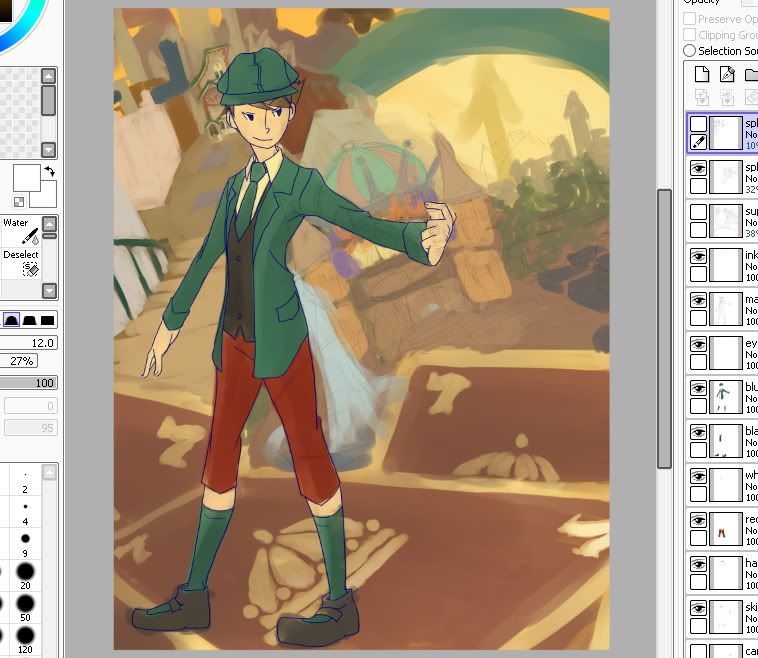 Missed coloring in some of Ingway's details. I totally extended his cape thing just because. |D Legs, I will never understand you. Mine are too pudgy to be a good ref for most people I draw. =w=; Frankly, I just don't like looking at them. I need to be careful about how I color this since it isn't brown and as dark like Legal Luke's (whose contrast was much easier to accomplish since I'm not dealing with Barney colors like I am here). Printers usually don't like how I color, but I still want to play with color here, so. We'll see?