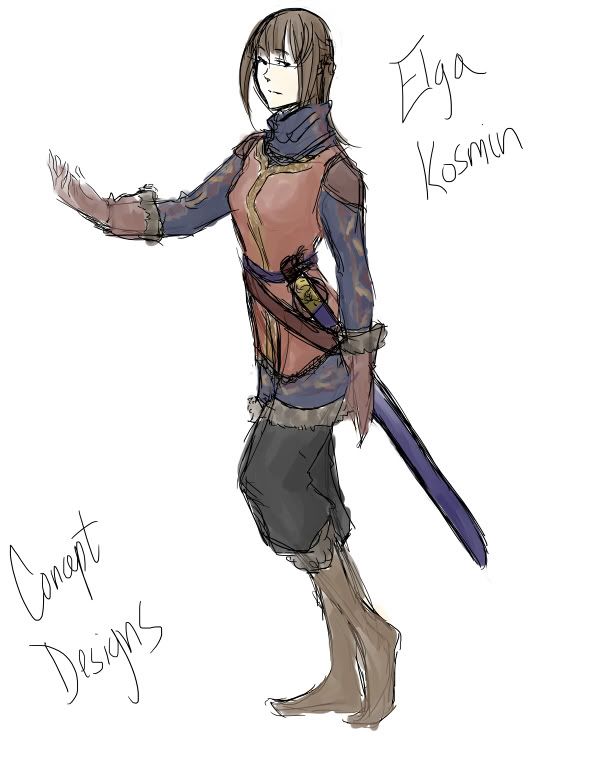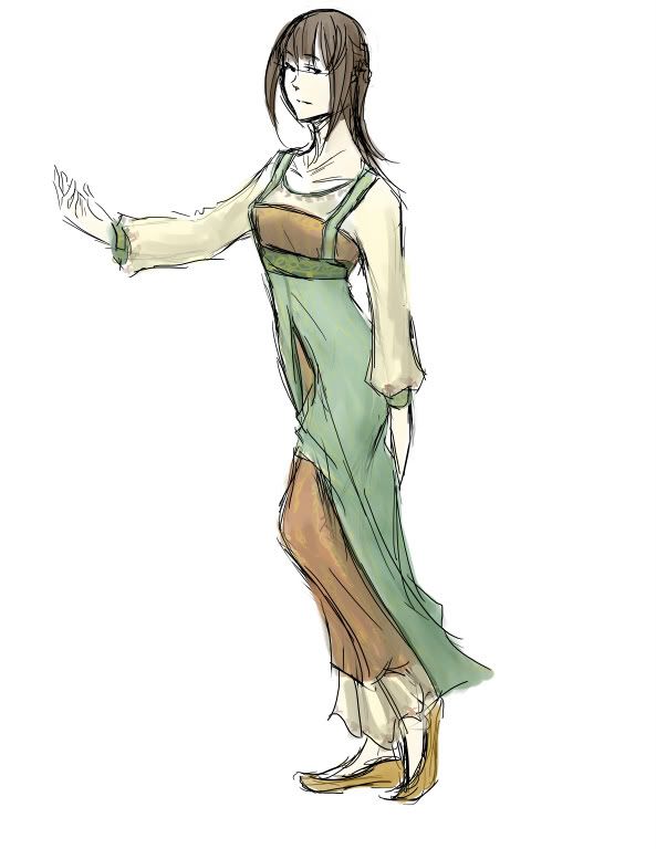 She iiisss the fantasy world's equivalent of a Cossack. As such, she uses a shashka (the blade really is turned upward while sheathed!) and wears very little armor. But I caved and gave her some mail, which is like an extra ten-plus pounds, but she's the general and pretty defenseless, and you kind of want the general/queen to stay alive, so she gives up some speed for defense? idk. I wanted to keep some kind of ethnic look, but it's not very cool looking. :/ She is not supposed to be MANLY though (tough and capable, yes) nor is she fighting for women's rights, so she wears dresses like normal girls. This is one of her simpler less ornate ones. :|b They really like layers over there. Three is hardly enough.